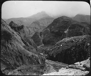 | Keywords: Upper part Riviere Blanche or Claire Pelee V-shaped notch YORYM-TA0317.jpg One slide and two negatives Steep-sided v-shaped river valley The course of the stream is in a flat floored gorge set in the bottom of the valley Remnants of terraces on the valley sides probably represent the top of the ash deposited in the valley in 1902 The v-shaped notch in the background and partly obscured by cloud was the point from which nuees ardentes issued in 1902 depicted people depicted place Rivière Blanche Martinique 1907 Black and White glass Lantern slide Institution Yorkshire Museum Natural History object history exhibition history credit line Yorkshire Museum York Museums Trust accession number YORYM TA317 The Tempest Anderson Photographic Archive held at York Museums Trust <br> York Museums Trust image PD-old-100 PD-US Uploaded with UploadWizard Images from the Tempest Anderson Collection vulcanology 1902 eruption of Mount Pelée 1907 photographs |