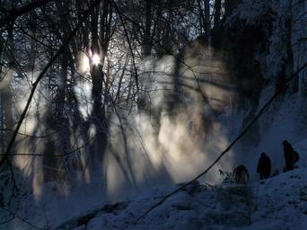 Keywords: urach waterfall back light fog haze winter wintry spray drizzle iced snow mystical ghostly mysterious swabian alb alb alb eaves urach