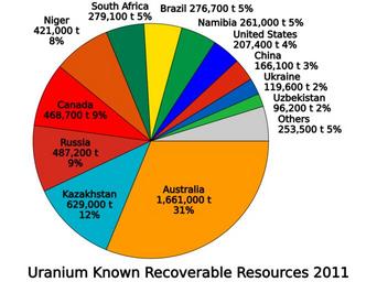 | Keywords: Uranium known recoverable resources.svg translate yes en Known recoverable uranium resources by country in tonnes as of 2011 based on up to USD 130/kg U At USD 260/kg U resources increase to 7 096 600 tonnes U and the resources of Namibia would exceed those of Niger Data from http //www world-nuclear org/info/Nuclear-Fuel-Cycle/Mining-of-Uranium/World-Uranium-Mining-Production/ World Nuclear Association 2015-01-11 own Delphi234 other versions cc-zero Uploaded with UploadWizard Uranium mining |