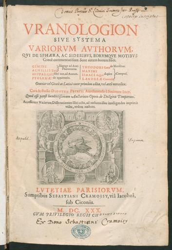 | Keywords: Uranologion, Denis Petau, 1630 (front page).jpg en Uranologion is an astronomy anthology covering works by the ancient Greek and Byzantine astronomers Written by Denis Pétau and published in Paris 1630 el Το Ουρανολόγιο είναι μια αστρονομική ανθολογία η ο οία καλύ τει τα έργα των αρχαίων ελλήνων και βυζαντινών αστρονόμων Γράφτηκε α ό τον γάλλο ιησουίτη τενί Πέτο και εκδόθηκε στο Παρίσι το 1630 2015-04-30 http //www e-rara ch/zut/content/titleinfo/648786 Denis Petau other versions Custom license marker 2015 04 30 PD-100 Uploaded with UploadWizard Books in Latin Old astronomical prints |