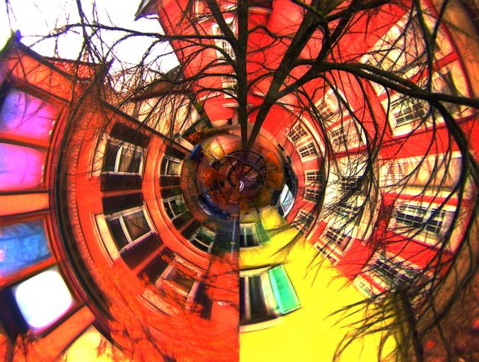 Keywords: urban courtyard modern pop art district abstract art colorful red orange turn color photo art window tree aesthetic branches