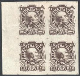 | Keywords: Uruguay 1883 Sc51a B4.jpg en Uruguay 1883 Sc51a imperforate unused block of four from left margin Catalogue Sc 51a 1883 own scan Uruguay post See more images Uruguay 1883 Sc51 jpg Uruguay 1883 bisect jpg Uruguay 1883 Sc51 B4 jpg Uruguay 1883 Sc51 B4 HI jpg Uruguay 1883 Sc51 B4 MP jpg Uruguay 1883 Sc51a B4 jpg LangSwitch Uruguay 10 centesimos brown issue 1883 Scott 51 Depicting José Gervasio Artigas Custom license marker 2016 04 16 PD-Uruguay PD-old-100 Stamps of Uruguay 1883 | ||||