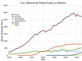 | Keywords: US Electricity Fossil Fuel vs Other.svg translate yes en US electrical generation Fossil fuels vs nuclear and renewable energy Also shown is generation from hydroelectricity wind and solar Source data from http //www eia gov/totalenergy/data/annual/index cfm electricity Table 8 2a Table 7 2a 2014-06-10 own Delphi234 current annually cc-zero Uploaded with UploadWizard Electricity in the United States Fossil fuels Electricity production trends | ||||