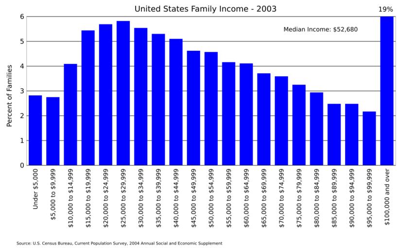 Keywords: US family income 2003.svg en United States family income distribution for 2003 Data from US Census https //www census gov/data/tables/time-series/demo/income-poverty/cps-finc/finc-01 html FINC-01 2016-06-16 own Delphi234 other versions cc-zero Income distribution in the United States |