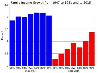 | Keywords: US family income growth from 1947 to 1981 and to 2015.svg translate yes en From 1947 to 1981 incomes in the United States grew at about 2 per year for all income groups from the bottom 20 to the top 5 but since 1981 average income only grew by 0 9 per year instead of by 2 1 Income for the bottom 20 grew by only 0 3 increasing to 1 4 for the top 5 67 of what it had been Data from US Census https //www census gov/data/tables/time-series/demo/income-poverty/cps-finc/finc-01 html 2016-09-23 own Delphi234 other versions cc-zero Income distribution in the United States |