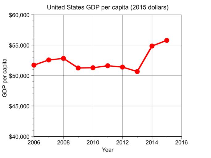 | Keywords: US GDP per capita.svg en GDP per capita of the United States in constant 2015 dollars Data from CIA https //www cia gov/library/publications/the-world-factbook/rankorder/2004rank html World Factbook 2016-06-03 own Delphi234 other versions current annually Generated with Wikimedia SVG Chart SVG Chart/box Data wikitable sortable - Year GDP per capita In 2015 dollars - 2006 44 000 51 730 - 2007 46 000 52 584 - 2008 48 000 52 841 - 2009 46 400 51 262 - 2010 47 200 51 304 - 2011 49 000 51 631 - 2012 49 800 51 410 - 2013 49 800 50 668 - 2014 54 800 54 865 - 2015 55 800 55 800 cc-zero Gross domestic product of the United States |