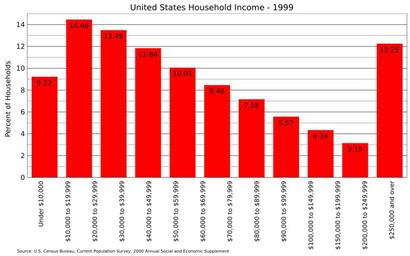 | Keywords: US household income 1999.svg en US household income distribution for 1999 Data from https //www census gov/hhes/www/income/data/incpovhlth/1999/index html Money Income in the United States 1999 2016-03-15 own Delphi234 other versions cc-zero Income distribution in the United States |