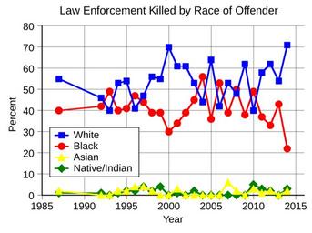 | Keywords: US Law Enforcement Killed by Race of Offender.svg translate yes en United States law enforcement homicides by known race of offender 95 were male 53 were white and 41 black from 1987 to 2014 Data point for 1987 is an average for 1987-1991 Data from https //www fbi gov/about-us/cjis/ucr/leoka Uniform Crime Reports 2016-07-13 own Delphi234 other versions Generated with Wikimedia SVG Chart SVG Chart/box cc-zero Homicide statistics Police of the United States | ||||