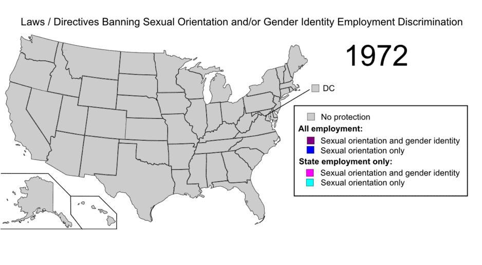 Keywords: US LGBT civil rights animation.gif Animated map displaying civil rights protection for employees based on sexual orientation and/or gender identity in the United States current as of November 24 2011 User Slyguy -- used Inkscape to create frames and Unfreez and Jasc Animation Shop for the animation 2011-11-24 Please refer to the citations contained within the lists on this page Based on Image Blank_US_Map svg GFDL List of events depicted in the animated map Chronological order 1972 gray No LGBT civil rights at the state level although the first local protections were enacted this year in Michigan in East Lansing and Ann Arbor and in New York City <ref>Eskridge William K Jr 1999 In http //books google com/books id BZTnDgeygHkC pg PA130 lpg PA130 Gaylaw Challenging the Apartheid of the Closet Harvard University Press paperback edition 2002 p 130 ISBN 0-674-00804-9 Google Books Retrieved on January 26 2011 </ref><br> 1973 District of Columbia blue Sexual orientation protected in all employment <ref name UnderstandingSocialProblemsp467 >Mooney Linda A David Knox Caroline Schacht 2009 In http //books google com/books id 1Zb3-2UxHyUC pg PT493 lpg PT493 Understanding Social Problems 6th Edition Wadsworth Cengage Learning p 467 ISBN 0-495-50428-9 Google Book Search Retrieved on January 23 2011 </ref><br> 1975 Pennsylvania teal Sexual orientation protected in state employment <ref name ThePoliticsOfGayRightsp272 >Rimmerman Craig A Kenneth D Wald Clyde Wilcox 2000 In http //books google com/books id wnZp_uITpTsC pg PA272 lpg PA272 The Politics of Gay Rights The University of Chicago Press p 272 ISBN 0-226-71999-5 Google Book Search Retrieved on January 23 2011 </ref><br> 1979 California teal Sexual orientation protected in state employment <ref name JerryBrown1979 >Brown Jerry http //www jerrybrown org/civil-rights Civil Rights Jerrybrown com Accessed 2011-01-23 </ref><br> 1982 Wisconsin blue Sexual orientation protected in all employment <ref name UnderstandingSocialProblemsp467 ></ref><br> 1983 New York teal Sexual orientation protected in state employment <ref name MarioCuomo1983 >Quinn Christine http //www gothamgazette com/article/fea/20040308/202/904 Bloomberg Must Speak Up on Gay Marriage Gotham Gazette 2004-03-08 Accessed 2011-01-23 </ref><br> 7 Ohio teal Sexual orientation protected in state employment <ref name GayPeoplesChronicleJanuary142011 >Resnick Eric http //www gaypeopleschronicle com/stories11/january/0114111 htm Kasich lets LGBT job bias rule expire Gay People's Chronicle 2011-01-14 Accessed 2011-01-23 </ref><br> 1985 New Mexico teal Sexual orientation protected in state employment <ref name NewMexico1985 >http //www hrc org/1525 htm New Mexico Non-Discrimination Law Human Rights Campaign 2007-03-20 Accessed 2011-01-23 </ref><br> 7 Rhode Island teal Sexual orientation protected in state employment <ref name RhodeIsland1985 >Cumming Doug http //pqasb pqarchiver com/projo/access/604929821 html dids 604929821 604929821 FMT ABS 'Gay rights' proponents foes to debate ordinance tonight 'Sexual orientation' back in spotlight at Providence hearing Fee required for access to the full article The Providence Journal 1985-09-03 Accessed 2011-01-23 </ref><ref name RhodeIsland1985b >http //www2 law ucla edu/williamsinstitute/programs/ENDA/Rhode 20Island 20Final pdf Memorandum -- Rhode Island -- Sexual Orientation and Gender Identity Law and Documentation of Discrimination p 9 Acrobat format Refers to Rhode Island Executive Order No 11 1985 Equal Opportunity and Affirmative Action Policy The Williams Institute 2009-09 Accessed 2011-01-25 </ref><br> 7 Washington teal Sexual orientation protected in state employment <ref name BoothGardner1985 >Gardner Booth http //www governor wa gov/execorders/eoarchive/eo85-09 htm Executive Order 85-09 Governor of Washington web site 1985-12-24 Accessed 2011-01-23 </ref><br> 1987 Oregon teal Sexual orientation protected in state employment <ref name Oregon1987 >http //news google com/newspapers id RKpFAAAAIBAJ sjid OocDAAAAIBAJ pg 3720 2165415 Roberts pushes gay rights bill 1991 April 17 The Associated Press via The Bulletin Bend Oregon p A-7 Retrieved January 23 2011 via Google News Archive </ref><br> 1988 Oregon gray Sexual orientation no longer protected in state employment <ref name Oregon1992 >Beggs Charles E 1992 November 12 http //news google com/newspapers id 3BcpAAAAIBAJ sjid mYYDAAAAIBAJ pg 6280 2560314 Anti-gay measure voided The Associated Press via The Bulletin Bend Oregon p A-1 Retrieved January 23 2011 via Google News archive </ref><br> 1989 Massachusetts blue Sexual orientation protected in all employment <ref name UnderstandingSocialProblemsp467 ></ref><br> 1990 Colorado teal Sexual orientation protected in state employment <ref name Colorado1990 >Robinson B A http //www religioustolerance org/hom_laws7 htm Targeting Gays and Lesbians Ruling by the U S Supreme Court in Romer v Evans Ontario Consultants on Religious Tolerance 2003-07-07 Accessed 2011-01-23 </ref><br> 1991 Connecticut blue Sexual orientation protected in all employment <ref name UnderstandingSocialProblemsp467 ></ref><br> 7 Hawaii blue Sexual orientation protected in all employment <ref name UnderstandingSocialProblemsp467 ></ref><br> 7 Minnesota teal Sexual orientation protected in state employment <ref name Minnesota1991 >Carlson Arne http //www leg mn/archive/execorders/91-04 pdf Executive Order 91-4 Adobe Acrobat format Minnesota Legislature 1991-01-29 Accessed 2011-01-23 </ref><br> 7 New Jersey teal Sexual orientation protected in state employment <ref name NewJersey1991 >Florio James G http //www state nj us/infobank/circular/eof39 htm Executive Order 39 The State of New Jersey 1991-08-16 Accessed 2011-01-23 </ref><br> 1992 California blue Sexual orientation protected in all employment <ref name UnderstandingSocialProblemsp467 ></ref><br> 7 Louisiana teal Sexual orientation protected in state employment <ref name Louisiana1992to2008 >http //www2 law ucla edu/will