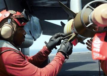 | Keywords: US Navy 011009-N-6234S-017 USS Carl Vinson (CVN 70).jpg en At sea aboard USS Carl Vinson CVN 70 Oct 9 2001 -- An Aviation Ordnanceman assigned to the Fighting Redcocks of Strike Fighter Squadron Two Two VFA-22 attaches a fin to a laser guided bomb on an F/A-18 Hornet in preparation for afternoon flight operations The USS Carl Vinson and its carrier airwing are conducting flight operations against terrorist training camps and military installations of the Taliban regime in Afghanistan The carefully targeted actions are designed to disrupt the use of Afghanistan as a base for terrorist operations and to attack the military capability of the Taliban regime Carl Vinson is operating in the Arabian Sea as part of Operation Enduring Freedom U S Navy Photo by Chief Photographer's Mate Daniel E Smith RELEASED 2001-10-09 011009-N-6234S-017 Navy http //www navy mil/view_image asp id 1489 U S Navy Photo by Chief Photographer's Mate Daniel E Smith PD-USGov-Military-Navy Aboard USS Carl Vinson CVN-70 Aviation Ordnanceman War in Afghanistan 2001-present related operations outside of Afghanistan Operation Enduring Freedom in 2001 United States Navy in the War in Afghanistan 2001-present Weapons of the War in Afghanistan 2001-present 2001 photographs Military people in 2001 People of the United States in 2001 October 2001 in the United States 9 October African American sailors Male soldiers Military people on duty Men at work Strike Fighter Squadron 22 United States Navy |