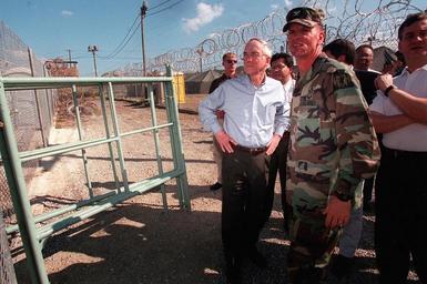 | Keywords: US Navy 020115-N-5636P-001 SECNAV visits Camp X-Ray.jpg en 020115-N-5636P-001 Camp X-Ray Guantanamo Bay Cuba Jan 15 2002 -- The Honorable Gordon England Secretary of the Navy center tours facilities at Camp X-Ray to see first hand the conditions provided Taliban and Al Qaida detainees The Secretary met with base officials concerning the progress of current and future construction at the camp Currently 158 detainees have been transferred from holding facilities in Afghanistan and are considered some of the most radical and dangerous currently in U S custody U S Navy photo by Chief Photographer s Mate Dolores L Parlato RELEASED 2002-01-15 020115-N-5636P-001 Navy http //www navy mil/view_image asp id 752 U S Navy photo by Chief Photographer s Mate Dolores L Parlato PD-USGov-Military-Navy Gordon R England Camp X-Ray |
