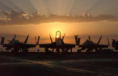 | Keywords: US Navy 020220-N-3896H-501 F-A-18's stand ready on flight deck.jpg en 020220-N-3896H-501 At sea aboard USS Theodore Roosevelt CVN 71 Feb 20 2002 -- At sunrise a row of F/A-18 Hornet strike fighters assigned to Carrier Air Wing One CVW-1 stand ready for another day of flight operations Roosevelt and CVW-1 are conducting missions in support of Operation Enduring Freedom U S Navy photo by Photographer s Mate 2nd Class Jeremy Hall RELEASED 2002-02-20 020220-N-3896H-501 Navy http //www navy mil/view_image asp id 831 U S Navy photo by Photographer s Mate 2nd Class Jeremy Hall PD-USGov-Military-Navy USS Theodore Roosevelt CVN-71 flight deck February 2002 photographs |