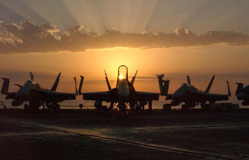 Keywords: US Navy 020220-N-3896H-501 F-A-18's stand ready on flight deck.jpg en 020220-N-3896H-501 At sea aboard USS Theodore Roosevelt CVN 71 Feb 20 2002 -- At sunrise a row of F/A-18 Hornet strike fighters assigned to Carrier Air Wing One CVW-1 stand ready for another day of flight operations Roosevelt and CVW-1 are conducting missions in support of Operation Enduring Freedom U S Navy photo by Photographer s Mate 2nd Class Jeremy Hall RELEASED 2002-02-20 020220-N-3896H-501 Navy http //www navy mil/view_image asp id 831 U S Navy photo by Photographer s Mate 2nd Class Jeremy Hall PD-USGov-Military-Navy USS Theodore Roosevelt CVN-71 flight deck February 2002 photographs