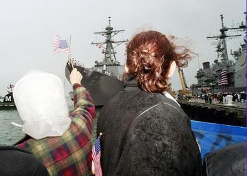 | Keywords: US Navy 020425-N-3692H-007 Family members greet USS Cole to Norfolk, VA.jpg en Naval Station Norfolk Va Apr 25 2002 -- Family and friends of the ship s crew welcome home USS Cole DDG 67 upon a return to her homeport The Cole has been at the Northrop Grumman Ship System facility in Pascagoula MS for the past 14 months undergoing repairs after a terrorist bomb blew a hole in her port side while refueling in the port city of Aden Yemen killing 17 sailors U S Navy photo by Photographer s Mate 3rd Class Stacey Hines RELEASED 2002-04-25 020425-N-3692H-007 Navy http //www navy mil/view_image asp id 1369 U S Navy photo by Photographer s Mate 3rd Class Stacey Hines PD-USGov-Military-Navy Naval Station Norfolk April 2002 photographs April 2002 in the United States April 2002 in Virginia Photographs of flags of the United States Sailors coming home 2002 in military history 25 April |