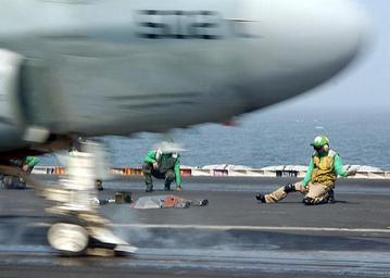 | Keywords: US Navy 020726-N-2147L-002 EA-6B Prowler receives signal for catapult launch.jpg en At sea aboard USS George Washington CVN 73 Jul 26 2002 -- Chief Aviation Boatswain's Mate Ricardo Joseph from New York NY gives the thumbs-up signal as an EA-6B Prowler assigned to the Scorpions from Tactical Electronic Warfare Squadron One Three Two VAQ 132 launches from the ship s flight deck George Washington and Carrier Air Wing One Seven CVW-17 are on a regularly-scheduled deployment conducting missions in support of Operation Enduring Freedom U S Navy photo by Photographer's Mate 2nd Class Corey T Lewis RELEASED 2002-07-26 020726-N-2147L-002 Navy http //www navy mil/view_image asp id 2112 U S Navy photo PD-USGov-Military-Navy Aboard USS George Washington CVN-73 Grumman EA-6 Prowler July 2002 photographs |