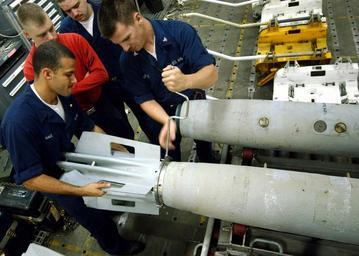 | Keywords: US Navy 020807-N-2147L-003 Sailors aboard CVN 73 dismantal a MK-82 bomb in one of the ship's magazines.jpg en At sea aboard USS George Washington CVN 73 Aug 7 2002 -- Airman Roosevelt Hall left from Los Angeles Calif and Aviation Ordnanceman 3rd Class Charles Wisneski from Little Fort N Y remove a bomb stabilizing unit from a Mark 82 500 pound bomb in one of the ship's weapons magazines The Washington battlegroup is on a six-month deployment conducting missions in support of Operation Enduring Freedom U S Navy photo by Photographer's Mate 2nd Class Corey T Lewis RELEASED 2002-08-07 020807-N-2147L-003 Navy http //www navy mil/view_image asp id 2214 U S Navy photo by Photographer's Mate 2nd Class Corey T Lewis PD-USGov-Military-Navy Sailors at sea Aboard USS George Washington CVN-73 Mark 82 bomb August 2002 photographs Military people in 2002 August 2002 in the United States Four men Photographs of standing men Men at work in the United States Military people on duty Personality rights |