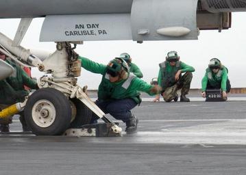 | Keywords: US Navy 020816-N-6268K-002 Sailor checks the launch bar of a F-A-18.jpg en At sea aboard USS George Washington CVN 73 Aug 16 2002 -- Aviation Boatswain's Mate 3rd Class Michael Cook from Shreveport Fla checks the launch bar on an F/A-18 Hornet assigned to Carrier Air Wing Seventeen CVW-17 Washington is homeported in Norfolk Va and is on a six-month deployment conducting missions in support of Operation Enduring Freedom U S Navy photo by Photographer's Mate Airman Matthew Keane RELEASED 2002-08-16 020816-N-6268K-002 Navy http //www navy mil/view_image asp id 2372 U S Navy photo by Photographer's Mate Airman Matthew Keane PD-USGov-Military-Navy 16 August August 2002 photographs August 2002 in the United States Aboard USS George Washington CVN-73 Military people in 2002 Personality rights |