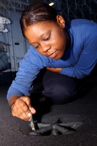 | Keywords: US Navy 020904-N-4953E-013 Cleaning the Pad Eyes on USS Truman.jpg  en At sea aboard USS Harry S Truman CVN 75 Sep 4 2002 -- Airman Shakkia Wray from Shelby N C assigned to Air Department's V-3 Division cleans the pad eyes in the hangar bay Truman is participating in the Composite Unit Training Exercise COMTUEX phase which is designed to train the ship airwing and other units in the battle group to function as one fighting force U S Navy photo by Photographer's Mate 3rd Class Danny Ewing Jr RELEASED 2002-09-04 020904-N-4953E-013 Navy http //www navy mil/view_image asp id 2605 U S Navy photo by Photographer's Mate 3rd Class Danny Ewing Jr PD-USGov-Military-Navy African American sailors Women at work in the United States Temporary for Cat-a-lot - Female humans Females with machines Human head tilting right Women's shirts People at work Human hair Fingers Eyelids Aboard USS Harry S Truman CVN-75 September 2002 photographs September 2002 in the United States Military people in 2002 Sailors at sea Taken with Nikon D1X Female sailors Blue clothing female Photographs by Danny Ewing Jr |