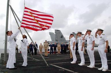 | Keywords: US Navy 020911-N-1058W-004 Sailors aboard USS Harry S. Truman (CVN 75) raise the.jpg en At sea aboard USS Harry S Truman CVN 75 Sep 11 2002 -- Sailors raise the Navy Jack at morning colors in commemoration of the events of September 11 2001 on the first observance of Patriot Day Under direction of the Secretary of the Navy Gordon R England all U S Navy ships will fly the Navy Jack in place of the Union Jack for the duration of the war on terrorism The Navy Jack is a flag consisting of a rattlesnake superimposed across 13 horizontal alternating red and white stripes with the motto Don t Tread on Me Attending the sunrise flag raising aboard the Truman are right to left Captain Michael R Groothousen Commanding Officer Captain Ted Carter Executive Officer Commander Alan Baker Command Chaplain and Command Master Chief Steve Markum U S Navy photo by Photographer's Mate 2nd Class H Dwain Willis RELEASED 2002-09-11 020911-N-1058W-004 Navy http //www navy mil/view_image asp id 2628 U S Navy photo by Photographer's Mate 2nd Class H Dwain Willis PD-USGov-Military-Navy Aboard USS Harry S Truman CVN-75 Alan T Baker Walter E Carter Jr Michael R Groothousen First anniversary of the September 11 2001 attacks Salutes |
