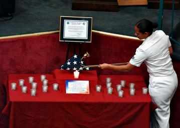 | Keywords: US Navy 020911-N-0967W-002 PCU Ronald Reagan Sailor prepares for Patriot Day observances on the first anniversary of 9-11.jpg en Newport News Va Sep 11 2002 -- Religious Program Specialist 2nd Class Sophia Flores stationed aboard Precommissioning Unit Ronald Reagan CVN 76 lights memorial candles in remembrance of the victims of the Sep 11 2001 during a memorial service held at the Full Gospel Church of Deliverance in Newport News Va An American flag flown over the Pentagon in honor of those lost along with a certificate of authenticity from the Secretary of Defense provided a fitting centerpiece during the service U S Navy photo by Photographer s Mate 3rd Class Anthony Walker RELEASED 2002-09-11 020911-N-0967W-002 Navy http //www navy mil/view_image asp id 2735 U S Navy photo by Photographer s Mate 3rd Class Anthony Walker PD-USGov-Military-Navy Images from US Navy location Newport News Virginia Aboard USS Ronald Reagan CVN-76 First anniversary of the September 11 2001 attacks September 2002 photographs September 2002 in Virginia Military people in 2002 Female sailors Women at work in the United States Women facing left and looking left Taken with Nikon D1X Personality rights |