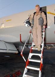 | Keywords: US Navy 021022-N-4374S-181 Lt. j.g. Dave Snyder, a pilot assigned to the.jpg en Central Command Area of Operation Oct 22 2002 -- Lt j g Dave Snyder a pilot assigned to the Screaming Eagles of Patrol Squadron One VP-1 steps down from the boarding ladder of a P-3C Orion after the completion of a reconnaissance mission over the Arabian Gulf The P-3C Orion is a land-based long-range anti-submarine warfare ASW and reconnaissance patrol aircraft VP-1 is homeported at Whidbey Island Wash and is on a regularly scheduled six-month deployment conducting missions in support of Operation Enduring Freedom U S Navy photo by Photographer s Mate 2nd Class Michael Sandberg RELEASED 2002-10-22 021022-N-4374S-181 Navy http //www navy mil/view_image asp id 3142 U S Navy photo by Photographer s Mate 2nd Class Michael Sandberg PD-USGov-Military-Navy United States Navy images from Central Command Patrol Squadron 1 United States Navy Aircraft access ladders October 2002 photographs |