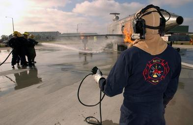 | Keywords: US Navy 021113-N-5862D-003 Firefighting training.jpg en Aboard Naval Air Station NAS Pensacola Nov 13 2002 -- Members of the training staff at the Naval Air Technical Training Center Air Dept demonstrate effective firefighting skills while approaching a fuel fire at the Aircraft Firefighting trainer facility Students in the aviation field receive basic and advanced aircraft firefighting instruction Controlled fires are set using flammable gas in various scenarios as students learn to use specialized equipment and techniques to fight fixed and rotary-winged aircraft fires at sea aboard ship U S Navy photo by Chief Photographer s Mate Chris Desmond RELEASED 021113-N-5862D-003 Navy http //www navy mil/view_image asp id 3513 U S Navy photo by Chief Photographer s Mate Chris Desmond PD-USGov-Military-Navy Naval Air Technical Training Center Firefighters |