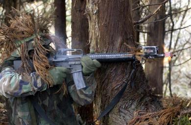| Keywords: US Navy 021121-N-8726C-008 Base security training.jpg en Aboard Misawa Air Force Base Japan Nov 21 2002 U S Navy Master-At-Arms 2nd Class Kevin Dennis assigned to the 35th Security Forces Squadron plays the role of sniper during air base defense training maneuvers Training is designed to prepare security units to protect forward deployed facilities and equipment against hostile forces including enemy fire and sniper fire U S Navy photo by Photographer s Mate 2nd Class John Collins RELEASED 2002-11-21 021121-N-8726C-008 Navy http //www navy mil/view_image asp id 3479 U S Navy photo by Photographer s Mate 2nd Class John Collins PD-USGov-Military-Navy Images from US Navy location MISAWA Japan M16 rifle with Multiple Integrated Laser Engagement System Military camouflage muzzle flashes of firearms Master-at-arms |