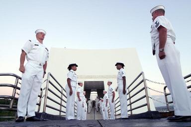 | Keywords: US Navy 021205-N-3228G-006 Naval Station Pearl Harbor side boys rehearse outside the USS Arizona Memorial.jpg en Pearl Harbor Hawaii Dec 5 2002 -- Naval Station Pearl Harbor side boys rehearse outside the USS Arizona Memorial for the upcoming Dec 7th commemoration ceremony hosted by Commander Navy Region Hawaii The ceremony will feature guest speaker senior Senator Daniel Inouye of Hawaii and the attendance of 16 Pearl Harbor survivors and their family members A wreath-laying by service members from each branch of the U S military services the Governor of Hawaii the Pearl Harbor Survivors Association and more than 20 veteran's groups will also be a part of the ceremony The commemoration is the 61st since the Dec 7 1941 attack on Pearl Harbor and is held to honor the men and women who lost their lives that day U S Navy photo by Photographer's Mate 1st Class William R Goodwin RELEASED 2002-12-05 021205-N-3228G-006 Navy http //www navy mil/view_image asp id 3606 U S Navy photo by Photographer's Mate 1st Class William R Goodwin PD-USGov-Military-Navy USS Arizona Memorial Photographs by William R Goodwin |