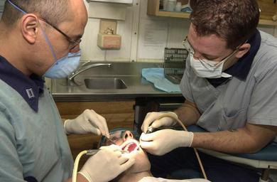 | Keywords: US Navy 021206-N-5152P-002 Dental work on a Sailor.jpg en At sea aboard USS Kitty Hawk CV 63 Nov 10 2002 -- Lt Raul Barrientos from New York N Y and Dental Technician Seaman Scott Lanney from South Hadley Mass drill on a Sailor s tooth to remove all signs of decay from a cavity and fill it with amalgam Amalgam is a mixture containing silver that is soft when placed into a cavity and is shaped by the dentist It will then hardens and prevent further deterioration of the tooth Kitty Hawk is the U S Navy s only forward-deployed aircraft carrier and operates out of Yokosuka Japan U S Navy photo by Photographer s Mate 2nd Class Justin Proulx RELEASED 2002-11-10 021206-N-5152P-002 Navy http //www navy mil/view_image asp id 3709 U S Navy photo by Photographer s Mate 2nd Class Justin Proulx PD-USGov-Military-Navy Aboard USS Kitty Hawk CV-63 |