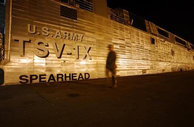 | Keywords: US Navy 030126-N-5319A-003 Chief Warrant Officer Four (CWO4) William R. Davis, skipper of United States Army Vessel (USAV) Theater Support Vessel Spearhead (TSV-1X), walks along side the ship while pier-side at a port within th.jpg en Central Command Area of Responsibility Jan 26 2003 Chief Warrant Officer Four CWO4 William R Davis skipper of United States Army Vessel USAV Theater Support Vessel Spearhead TSV-1X walks along side the ship while pier-side at a port within the Central Command AOR The 98-meter wave piercing catamaran can average a speed of 40+ knots and will be utilized on missions to maximize its speed and flexibility to transport troops and cargo Spearhead is currently forward deployed in support of Operation Enduring Freedom U S Navy photo by Photographer s Mate 1st Class Brien Aho RELEASED 2003-01-26 030126-N-5319A-003 Navy http //www navy mil/view_image asp id 11955 U S Navy photo by Photographer s Mate 1st Class Brien Aho PD-USGov-Military-Navy TSV-1X ship 2002 United States Navy images from Central Command |