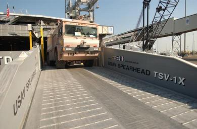 | Keywords: US Navy 030126-N-5319A-009 United States Army Vessel (USAV) Theater Support Vessel Spearhead (TSV-1X) off-loads an Army fire-fighting vehicle while pier-side at a port within the Central Command AOR.jpg en Central Command Area of Responsibility Jan 26 2003 United States Army Vessel USAV Theater Support Vessel Spearhead TSV-1X off-loads an Army fire-fighting vehicle while pier-side at a port within the Central Command AOR The 98-meter wave-piercing catamaran can average a speed of 40+ knots and will be utilized on missions to maximize its speed and flexibility to transport troops and cargo Spearhead is currently forward deployed in support of Operation Enduring Freedom U S Navy photo by Photographer s Mate 1st Class Brien Aho RELEASED 2003-01-26 030126-N-5319A-009 Navy http //www navy mil/view_image asp id 11956 U S Navy photo by Photographer s Mate 1st Class Brien Aho PD-USGov-Military-Navy United States Navy images from Central Command |
