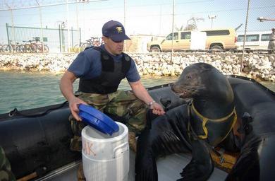 | Keywords: US Navy 030129-N-5319A-002 Shallow Water Intruder Detection System (SWIDS) program.jpg en Central Command Area of Responsibility Jan 29 2003 -- A U S Navy SEAL Sea Air and Land feeds chum to Zak a 375-pound California sea lion during one of many training swims taking place in the Central Command AOR Zak is participating in the Space and Naval Warfare Systems Center s Shallow Water Intruder Detection System SWIDS program Zak has been trained to locate swimmers near piers ships and other objects in the water considered suspicious and a possible threat to military forces in the area SWIDS program has been deployed as part of the continued effort to support missions under Operation Enduring Freedom U S Navy Photograph by Photographers Mate First Class Brien Aho RELEASED 2003-01-29 030129-N-5319A-002 Navy http //www navy mil/view_image asp id 4357 U S Navy photo PD-USGov-Military-Navy United States Navy images from Central Command United States Navy Marine Mammal Program People with sea mammals |