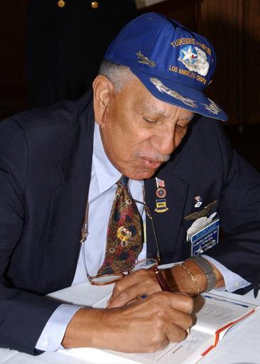 | Keywords: US Navy 030207-N-8894M-008 1st LT William B. Ellis, a Tuskegee Airmen in World War II assigned to the Fighting 99th, 332nd Fighter Wing, signs an autograph during an African American History month breakfast.jpg en Naval Base Point Loma San Diego Calif Feb 7 2003 -- 1st LT William B Ellis a Tuskegee Airmen in World War II assigned to the Fighting 99th 332nd Fighter Wing signs an autograph during an African American History month breakfast On Jul 19 1941 the Army Air Force began a program in Alabama to train black Americans as military pilots Once a cadet completed primary training at Tuskegee's Moton Field he was sent to nearby Tuskegee Army Air Field for completion of flight training and for transition to combat type aircraft U S Navy photo by Photographer's Mate 2nd Class Frederick McCahan RELEASED 2003-02-07 030207-N-8894M-008 Navy http //www navy mil/view_image asp id 4505 U S Navy photo by Photographer's Mate 2nd Class Frederick McCahan PD-USGov-Military-Navy Naval Base Point Loma Tuskegee Airmen |