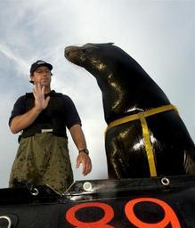 | Keywords: US Navy 030212-N-3783H-008 A Sea Lion trainer from Space and Naval Warfare Systems Center (SPAWAR), San Diego, works on hand signal commands with Zak, a 375-pound California sea lion.jpg en Central Command Area of Responsibility Feb 12 2003 -- A Sea Lion trainer from Space and Naval Warfare Systems Center SPAWAR San Diego works on hand signal commands with Zak a 375-pound California sea lion during a harbor patrol training swim mission Zak is participating in the Space and Naval Warfare Systems Center s Shallow Water Intruder Detection System SWIDS program Zak has been trained to locate swimmers near piers ships and other objects in the water considered suspicious and a possible threat to military forces in the area SWIDS program has been deployed as part of the continued effort to support missions under Operation Enduring Freedom U S Navy Photograph by Photographers Mate 2nd Class Bob Houlihan RELEASED 2003-02-12 030212-N-3783H-008 Navy http //www navy mil/view_image asp id 4499 U S Navy photo PD-USGov-Military-Navy United States Navy Marine Mammal Program |