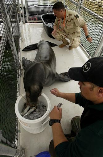 Keywords: US Navy 030213-N-3783H-009 Zak, a 375-pound California sea lion, gets a physical from a U.S. Army veterinarian and a distracting snack from his trainer.jpg en Central Command Area of Responsibility Feb 13 2003 -- Zak a 375-pound California sea lion gets a physical from a U S Army veterinarian and a distracting snack from his trainer Zak is participating in the Space and Naval Warfare Systems Center s Shallow Water Intruder Detection System SWIDS program Zak is trained to locate swimmers and other small-sized objects considered suspicious near piers and ships which may pose a threat to military forces in the area The SWIDS program has been deployed as part of the continued effort to support missions under Operation Enduring Freedom U S Navy Photograph by Photographers Mate 2nd Class Bob Houlihan RELEASED 2003-02-13 030213-N-3783H-009 Navy http //www navy mil/view_image asp id 4554 U S Navy photo PD-USGov-Military-Navy United States Navy images from Central Command United States Navy Marine Mammal Program People with animals Zalophus californianus Veterinarians Seal trainers |