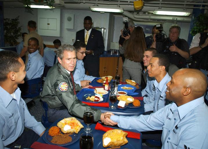 Keywords: US Navy 030213-N-0874H-004 Presiden Bush has lunch with Sailors aboard USS Philippine Sea.jpg en Aboard USS Philippine Sea CG 58 Feb 13 2002 -- While visiting Naval Station Mayport Fla President George W Bush has lunch with Sailors stationed aboard the guided missile cruiser USS Philippine Sea During a speech earlier in the day President Bush thanked Sailors and their families for their sacrifices and the continuing effort with the global war on terror The United States Navy carries the might and the mission of America to the farthest parts of the world the President said U S Navy Photo by Photographer s Mate 2nd Class Chuck Hill RELEASED 2002-02-13 030213-N-0874H-004 Navy http //www navy mil/view_image asp id 4524 U S Navy Photo by Photographer s Mate 2nd Class Chuck Hill PD-USGov-Military-Navy Aboard USS Philippine Sea CG-58 George W Bush in 2003 Handshakes involving the military |