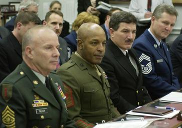 | Keywords: US Navy 030305-F-3050V-051 Top senior enlisted members during a hearing of the House Appropriations subcommittee on Military Construction.jpg en Capitol Hill Washington D C Mar 5 2003 -- From left Sgt Maj of the Army Jack L Tilley Sgt Maj of the Marine Corps Alford L McMichael Master Chief Petty Officer of the Navy Terry Scott and Chief Master Sgt of the Air Force Gerald R Murray listen to opening statements given by Chairman Joe Knollenberg during a hearing of the House Appropriations subcommittee on Military Construction The House Appropriations Committee has jurisdiction over discretionary spending which is approximately one-third of the federal budget It consists of thousands of programs controlled through annual appropriations acts U S Air Force photo by Tech Sgt Jim Varhegyi RELEASED 2003-03-05 030305-F-3050V-051 Navy http //www navy mil/view_image asp id 4985 U S Navy photo PD-USGov-Military-Navy Capitol Hill Washington D C Gerald R Murray Jack L Tilley Alford L McMichael Terry D Scott Photographs by James E Varhegyi |