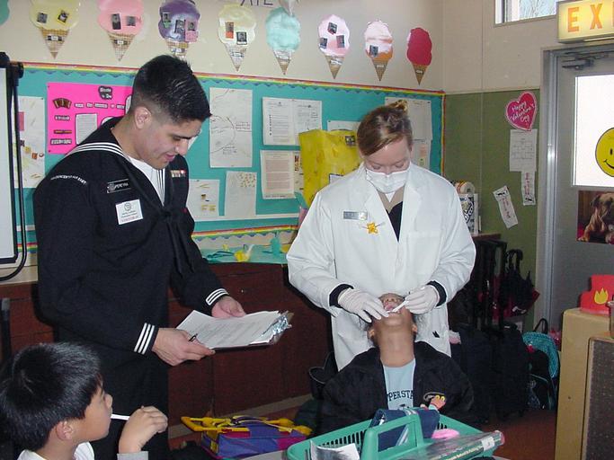 Keywords: US Navy 030312-N-0000X-001 Dental Technician 3rd Class Omar Pereyra (Left) and Lt. Angela Estepp check a student^rsquo,s teeth during National Children^rsquo,s Dental Health Month.jpg en Naval Station Yokosuka Japan Mar 12 2003 -- Dental Technician 3rd Class Omar Pereyra Left and Lt Angela Estepp check a student s teeth during National Children s Dental Health Month National Children s Dental Health Month grew out of a one-day event in Cleveland Ohio in 1941 In 1949 the American Dental Association sponsored the first national observance of Children s Dental Health Day which was expanded to a weeklong program in 1955 and to the month of February in 1981 Today it is marked in communities across the country and armed service bases abroad U S Navy photo by Laurie Clark RELEASED 2003-03-12 030312-N-0000X-001 Navy http //www navy mil/view_image asp id 5111 U S Navy photo by Laurie Clark PD-USGov-Military-Navy Dentists at work United States Fleet Activities Yokosuka