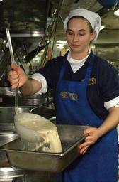 | Keywords: US Navy 030312-N-7986B-022 A Mess Specialist prepares the evening meal in the galley aboard USS Harry S. Truman (CVN 75).jpg en The Mediterranean Sea Mar 12 2003 -- A Mess Specialist prepares the evening meal in the galley aboard USS Harry S Truman CVN 75 Truman and Carrier Air Wing Three CVW-3 are deployed conducting combat missions in support of Operation Iraqi Freedom Operation Iraqi Freedom is the multi-national coalition effort to liberate the Iraqi people eliminate Iraq's weapons of mass destruction and end the regime of Saddam Hussein U S Navy photo by Seaman Jose L Barrientos Jr RELEASED 2003-03-12 030312-N-7986B-022 Navy http //www navy mil/view_image asp id 6374 U S Navy photo by Seaman Jose L Barrientos Jr PD-USGov-Military-Navy Aboard USS Harry S Truman CVN-75 |