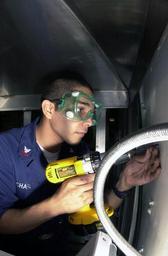| Keywords: US Navy 030401-N-1577S-002 Hull Technician 2nd Class David Chapa from Pleasanton, Texas, lines up his drill to begin installation of an electrical outlet aboard USS Nimitz (CVN 68).jpg en The Indian Ocean Apr 1 2003 -- Hull Technician 2nd Class David Chapa from Pleasanton Texas lines up his drill to begin installation of an electrical outlet aboard USS Nimitz CVN 68 Nimitz and her battle group are currently deployed and en route to the Arabian Gulf in support of Operation Iraqi Freedom Operation Iraqi Freedom is the multi-national coalition effort to liberate the Iraqi people eliminate Iraq's weapons of mass destruction and end the regime of Saddam Hussein U S Navy photo by Photographer s Mate Airman Timothy F Sosa RELEASED 2003-04-01 030401-N-1577S-002 Navy http //www navy mil/view_image asp id 6170 U S Navy photo by Photographer s Mate Airman Timothy F Sosa PD-USGov-Military-Navy Aboard USS Nimitz CVN-68 |