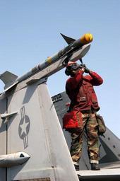 | Keywords: US Navy 030403-N-9228K-044 An Aviation Ordnancemen tightens down the guidance fins on an AIM-9 Sidewinder air-to-air missile loaded onto an F-A-18C Hornet.jpg en The Arabian Gulf Apr 03 2003 -- An Aviation Ordnancemen tightens down the guidance fins on an AIM-9 Sidewinder air-to-air missile loaded onto an F/A-18C Hornet assigned to the Eagles of Strike Fighter Squadron One Fifteen VFA-115 on the flight deck aboard USS Abraham Lincoln CVN 72 Lincoln and Carrier Air Wing Fourteen CVW-14 are deployed conducting combat missions in support of Operation Iraqi Freedom Operation Iraqi Freedom is the multi-national coalition effort to liberate the Iraqi people eliminate Iraq's weapons of mass destruction and end the regime of Saddam Hussein U S Navy photo by Photographer's Mate 3rd Class Michael S Kelly RELEASED 2003-04-03 030403-N-9228K-044 Navy http //www navy mil/view_image asp id 6305 U S Navy photo by Photographer's Mate 3rd Class Michael S Kelly PD-USGov-Military-Navy AIM-9 Sidewinder Aboard USS Abraham Lincoln CVN-72 Aviation Ordnanceman Strike Fighter Squadron 115 United States Navy |