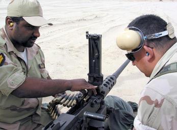| Keywords: US Navy 030412-N-1050K-033 Pvt. Mubarek, a Kuwaiti Sailor assigned to a Force Protection Team loads a strand of ammunition into a M2 .50 caliber machine gun under the watchful eye of Gunner's Mate 2nd Class Miguel Martinez.jpg en Camp Patriot Kuwait Apr 12 2003 -- Pvt Mubarek a Kuwaiti Sailor assigned to a Force Protection Team loads a strand of ammunition into a M2 50 caliber machine gun under the watchful eye of Gunner's Mate 2nd Class Miguel Martinez 34 from Dallas Texas during a recent joint live fire exercise here Martinez and others attached to Mobile Inshore Undersea Warfare Unit One Zero Nine MIUW-109 homeported in Fort Worth Texas described the specifics of the M2 to 20 Kuwaiti security force personnel during a joint nation crew serve weapons familiarization training fire MIUWU-109 is one of the key all-reserve units attached to Naval Coastal Warfare Group One NCWG-1 forward deployed to handle force protection responsibilities at Camp Patriot Camp Patriot is home to nearly 3 000 active duty and reserve Sailors Soldiers Marines Airmen and Coast Guardsmen forward deployed in support of Operation Iraqi Freedom Operation Iraqi Freedom is the multi-national coalition effort to liberate the Iraqi people eliminate Iraq s weapons of mass destruction and end the regime of Saddam Hussein U S Navy photo by Journalist 1st Class Joseph Krypel RELEASED 2003-04-12 030412-N-1050K-033 Navy http //www navy mil/view_image asp id 6632 U S Navy photo by Journalist 1st Class Joseph Krypel PD-USGov-Military-Navy Camp Patriot Browning M2 of the US Navy People of the Kuwaiti Navy Mobile Inshore Undersea Warfare Unit 109 |