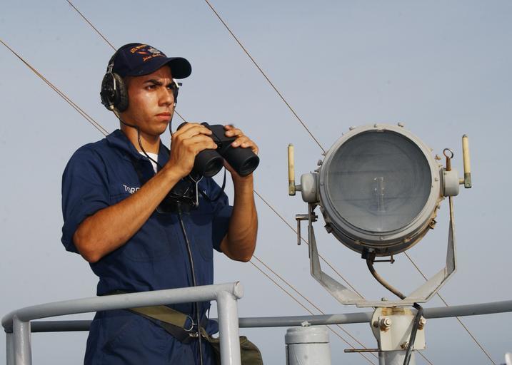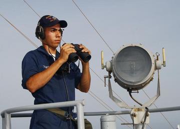 | Keywords: US Navy 030414-N-2160C-003 Seaman Isaac Torres from Cleveland, Ohio, vigilantly stand the ship's forward look-out watch from the signal bridge of USS Mount Whitney (LCC-JCC 20).jpg en The Gulf of Aden Apr 14 2003 -- Seaman Isaac Torres from Cleveland Ohio vigilantly stand the ship's forward look-out watch from the signal bridge of USS Mount Whitney LCC/JCC 20 Mount Whitney and her embarked staff are deployed to the Horn of Africa region participating in Operation Enduring Freedom and the global war on terrorism U S Navy photo by Photographer s Mate 2nd Class Steven G Crawford RELEASED 2003-04-14 030414-N-2160C-003 Navy http //www navy mil/view_image asp id 6849 U S Navy photo by Photographer s Mate 2nd Class Steven G Crawford PD-USGov-Military-Navy Aboard USS Mount Whitney LCC-20 Naval signalling lamps People with binoculars |