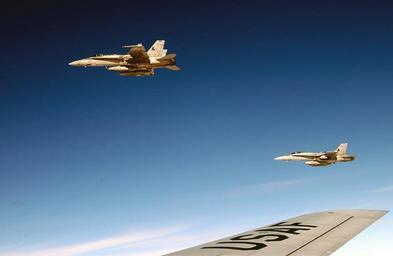 | Keywords: US Navy 030417-F-6809H-019 F-A-18 Hornets are ready to return to their mission after conducting refueling operations with a U.S. Air Force KC-135R Stratotanker.jpg en The Mediterranean Sea Apr 16 2003 -- Over the Middle East F/A-18 Hornets assigned to the Bulls of Strike Fighter Squadron Thirty Seven VFA-37 aboard USS Harry S Truman are ready to return to their mission after conducting refueling operations with a U S Air Force KC-135R Stratotanker The Stratotanker is stationed at a forward deployed operating base located in the Mediterranean region in support of Operation Iraqi Freedom Operation Iraqi Freedom is the multinational coalition effort to liberate the Iraqi people eliminate Iraq's weapons of mass destruction and end the regime of Saddam Hussein U S Air Force photo by Tech Sgt Robert J Horstman RELEASED 2003-04-16 030417-F-6809H-019 Navy http //www navy mil/view_image asp id 6962 U S Navy photo PD-USGov-Military-Navy Images from US Navy ship USS Harry S Truman are ready to return to their mission after conducting refueling operations with a U S Air Force KC-135R Stratotanker The Stratotanker is stationed at a forward deployed operating base located in the Mediterranean region in support of Operation Iraqi Freedom Operation Iraqi Freedom is the multinational coalition effort to liberate the Iraqi people eliminate Iraq's weapons of mass destruction and end the regime of Saddam Hussein U S Air Force photo by Tech Sgt Robert J Horstman RELEASED F/A-18 Hornet in flight Strike Fighter Squadron 37 United States Navy |
