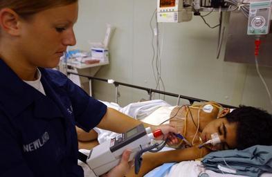 | Keywords: US Navy 030423-N-6967M-251 Hospital Corpsman 2nd Class Jessica Newland takes the temperature of a boy in the Intensive Care Unit (ICU) aboard USNS Comfort (T-AH 20).jpg en Aboard USNS Comfort T-AH 20 Apr 23 2003 -- Hospital Corpsman 2nd Class Jessica Newland takes the temperature of a boy in the Intensive Care Unit ICU aboard USNS Comfort T-AH 20 Comfort is one of two hospital ships operated by Military Sealift Command and is designed to provide emergency on-site care for U S combatant forces deployed in war or other operations USNS Mercy T-AH 19 and Comfort each contain 12 fully-equipped operating rooms a 1 000 bed hospital facility digital radiological services a diagnostic and clinical laboratory a pharmacy an optometry lab a cat scan and two oxygen producing plants Both hospital ships are converted San Clemente-class super tankers Comfort set sail for New York City and provided housing laundry food medical and other services to volunteers and rescue personnel for nearly three weeks in the wake of the terrorist attack on the World Trade Center Comfort was activated again in December 2002 and sailed to the Arabian Gulf to support Operation Iraqi Freedom the multi-national coalition effort to liberate the Iraqi people eliminate Iraq s weapons of mass destruction and end the regime of Saddam Hussein U S Navy photo by Photographer's Mate 1st Class Shane T McCoy RELEASED 2003-04-23 030423-N-6967M-251 Navy http //www navy mil/view_image asp id 10877 U S Navy photo by Photographer's Mate 1st Class Shane T McCoy PD-USGov-Military-Navy Aboard USNS Comfort T-AH-20 Intensive-care units Taken with Nikon D1X Hospital beds Photographs by Shane T McCoy |