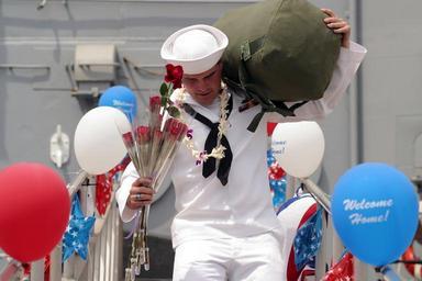 | Keywords: US Navy 030427-N-3228G-002 A Sailor rushes down the brow of Oliver Hazard Perry-class guided missile frigate USS Reuben James (FFG 57) to meet family members shortly after returning to homeport.jpg en Pearl Harbor Hawaii Apr 27 2003 -- A Sailor rushes down the brow of Oliver Hazard Perry-class guided missile frigate USS Reuben James FFG 57 to meet family members shortly after returning to homeport following over nine months at sea the ship s longest deployment in 30 years Reuben James deployed in support of Operation Iraqi Freedom the multi-national coalition effort to liberate the Iraqi people eliminate Iraq s weapons of mass destruction and end the regime of Saddam Hussein U S Navy photo by Photographer s Mate 1st Class William R Goodwin RELEASED 2003-04-27 030427-N-3228G-002 Navy http //www navy mil/view_image asp id 7202 U S Navy photo by Photographer s Mate 1st Class William R Goodwin PD-USGov-Military-Navy People at Pearl Harbor 2003 in Pearl Harbor Images from US Navy location Pearl Harbor Hawaii USS Reuben James FFG-57 Photographs by William R Goodwin |