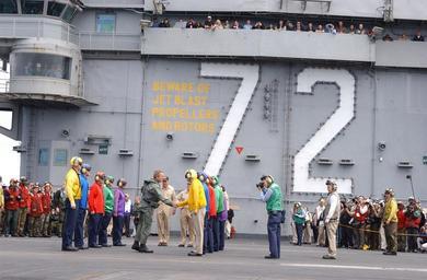 | Keywords: US Navy 030501-N-6020P-031 President George W. Bush greets Sailors aboard USS Abraham Lincoln (CVN 72).jpg en Pacific Ocean May 1 2003 -- President George W Bush greets Sailors on the Rainbow Sideboys detail after successfully trapping aboard the USS Abraham Lincoln CVN 72 in a S-3B Viking assigned to the Blue Wolves of Sea Control Squadron Three Five VS-35 designated NAVY 1 President Bush is the first sitting President to trap aboard an aircraft carrier at sea The President is conducting a visit aboard ship to meet with the Sailors and will address the Nation as Lincoln prepares to return from a 10-month deployment to the Arabian Gulf in support of Operation Iraqi Freedom U S Navy photo by Photographer's Mate Airman Gabriel Piper RELEASED 2003-05-01 030501-N-6020P-031 Navy http //www navy mil/view_image asp id 7186 U S Navy photo by Photographer's Mate Airman Gabriel Piper PD-USGov-Military-Navy Aboard USS Abraham Lincoln CVN-72 72 number George W Bush in 2003 Rainbow sideboys |