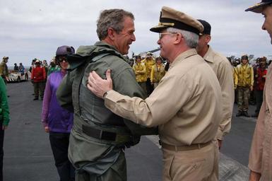 | Keywords: US Navy 030501-N-6817C-052 President George W. Bush greets Rear Admiral John Kelly on the flight deck after a successful trap aboard USS Abraham Lincoln (CVN 72).jpg en Pacific Ocean May 1 2003 -- President George W Bush greets Rear Admiral John Kelly on the flight deck after a successful trap aboard USS Abraham Lincoln CVN 72 in a S-3B Viking assigned to the Blue Wolves of Sea Control Squadron Three Five VS-35 designated NAVY 1 President Bush is the first sitting President to trap aboard an aircraft carrier at sea The President is conducting a visit aboard ship to meet with the Sailors and will address the Nation as Lincoln prepares to return from a 10-month deployment to the Arabian Gulf in support of Operation Iraqi Freedom U S Navy photo by Photographer's Mate Airman Gabriel Piper RELEASED 2003-05-01 030501-N-6817C-052 Navy http //www navy mil/view_image asp id 7191 U S Navy photo by Photographer's Mate Airman Gabriel Piper PD-USGov-Military-Navy Aboard USS Abraham Lincoln CVN-72 |