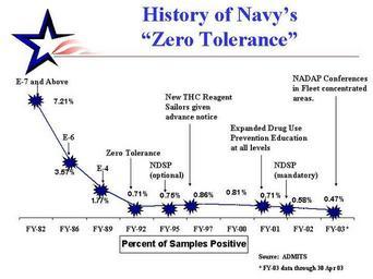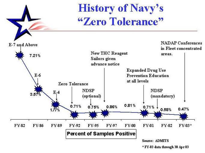 | Keywords: US Navy 030602-N-0000X-001 Zero Tolerance statistics show drug use in the U.S. Navy is down more than other services.jpg en Millington Tenn Jun 2 2003 -- The Navy's history of Zero Tolerance with relation to illegal drug use clearly shows dramatic gains in the reduction of illicit drug use In 1982 the first year of urinalysis screening the percentage of positive samples was 7 21 percent Statistics through the end of April 2003 show that percentage of positive samples at 0 47 Zero Tolerance is defined as all personnel found guilty of a single incident of drug use must be processed for administrative separation This has proven to be quite effective as is revealed in a worldwide survey of health related behaviors sponsored by the Department of Defense in 1998 The U S Navy was singled out as the only military service with a significant decrease in drug use since 1995 U S Navy graphic RELEASED 2003-06-02 030602-N-0000X-001 Navy http //www navy mil/view_image asp id 7793 U S Navy photo PD-USGov-Military-Navy Illicit drug use statistics |