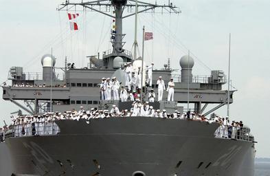 | Keywords: US Navy 030613-N-6925C-013 Sailors on board the amphibious command and control ship USS Mt. Whitney (LCC-JCC 20) gather on the ship's bow, eager to see family members on the pier during homecoming celebrations.jpg en Naval Station Norfolk Va Jun 13 2003 -- Sailors on board the amphibious command and control ship USS Mt Whitney LCC/JCC 20 gather on the ship's bow eager to see family members on the pier during homecoming celebrations Mount Whitney completed a seven-month deployment as the flagship of Commander Joint Task Force Horn of Africa CJTF-HOA The most sophisticated command control communications computer and intelligence C4I ship ever commissioned Mount Whitney incorporates various elements of the most advanced C4I equipment available today Mount Whitney departed Nov 12 2002 in support of the ongoing war on terrorism and Operation Enduring Freedom U S Navy photo by Chief Photographer's Mate Thomas Coffelt RELEASED 2003-06-13 030613-N-6925C-013 Navy http //www navy mil/view_image asp id 8037 U S Navy photo by Chief Photographer's Mate Thomas Coffelt PD-USGov-Military-Navy Naval Station Norfolk Sailors coming home Aboard USS Mount Whitney LCC-20 |